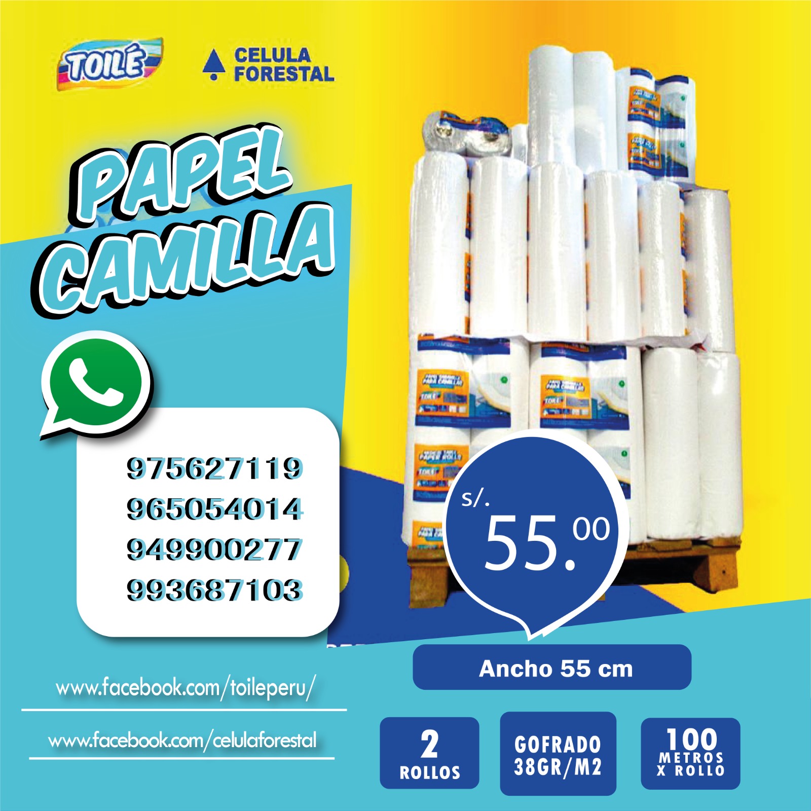 Papel sabanilla de ancho 50 cm de marca TOILE, presentación de 2 rollos por paquete de 100 mts de largo, acabado pre-cortado